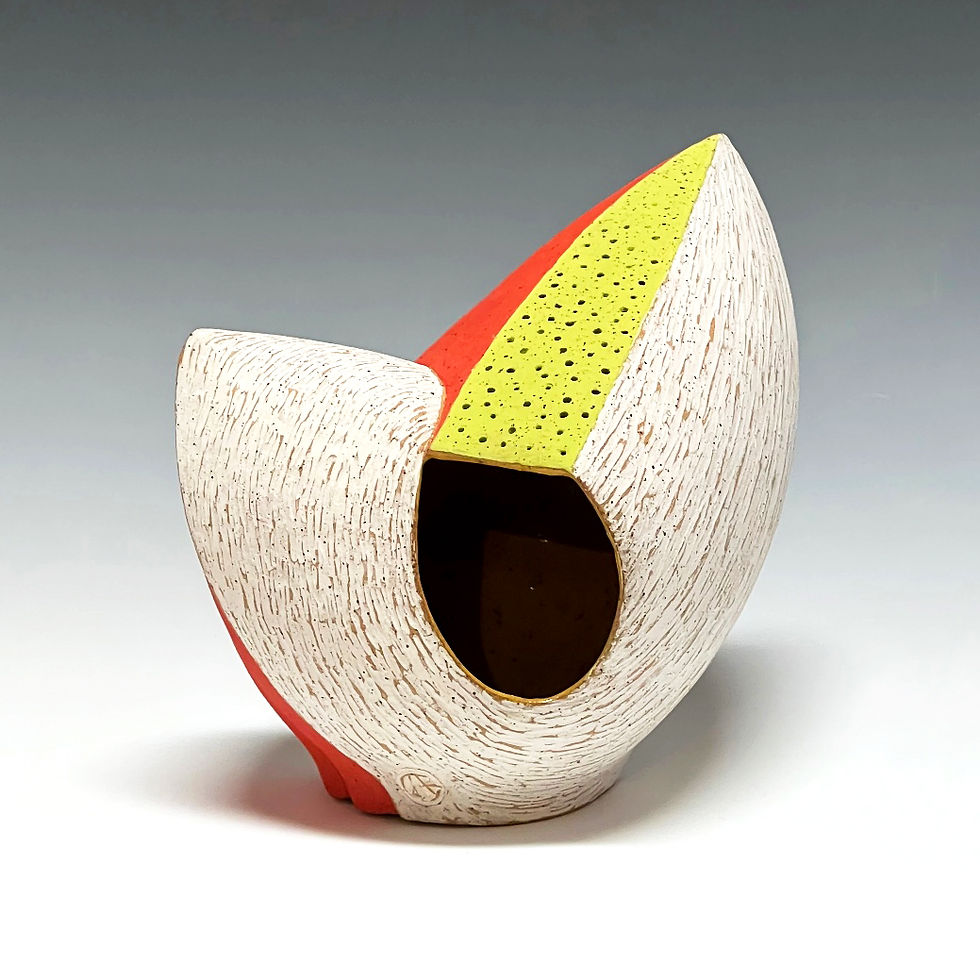 Hand built, carved, and painted with underglazes and glazes; fired to cone 5. 2023 (9"h x 9"w x 7”d